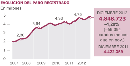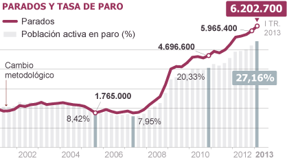 España nunca hasta la fecha había tenido tantos desempleados y una tasa de paro tan alta. El número de ocupados retrocede a niveles de hace una década. La persistencia del deterioro económico vuelve a pasar factura al mercado laboral español y persiste el impacto de los ajustes en el empleo público. Los hogares con todos sus miembros activos en paro sube en 72.400 y se acerca a los dos millones