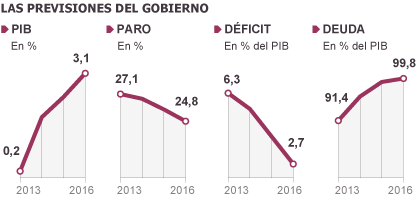 La tasa de paro acabará la legislatura tres puntos por encima de cuando llegó al poder. Se prorroga un año la subida del IRPF y sube el impuesto de sociedades. El Ejecutivo aplaza a 2016 el objetivo de déficit del 3%. La deuda pública rozará el 100% del PIB. Las reformas estaban ya anunciadas, salvo la desindexación de los precios públicos del IPC